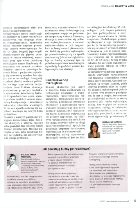 Blizny potrądzikowe pojawiają się na skórze w wyniku braku lub niewłaściwego leczenia, bardzo często na skutek samodzielnego wyciskania zmian trądzikowych, głównie tych zapalnych, takich jak grudki i krostki – wyjaśnia dr n. med. Kamila Padlewska na łamach magazynu Beauty Forum.